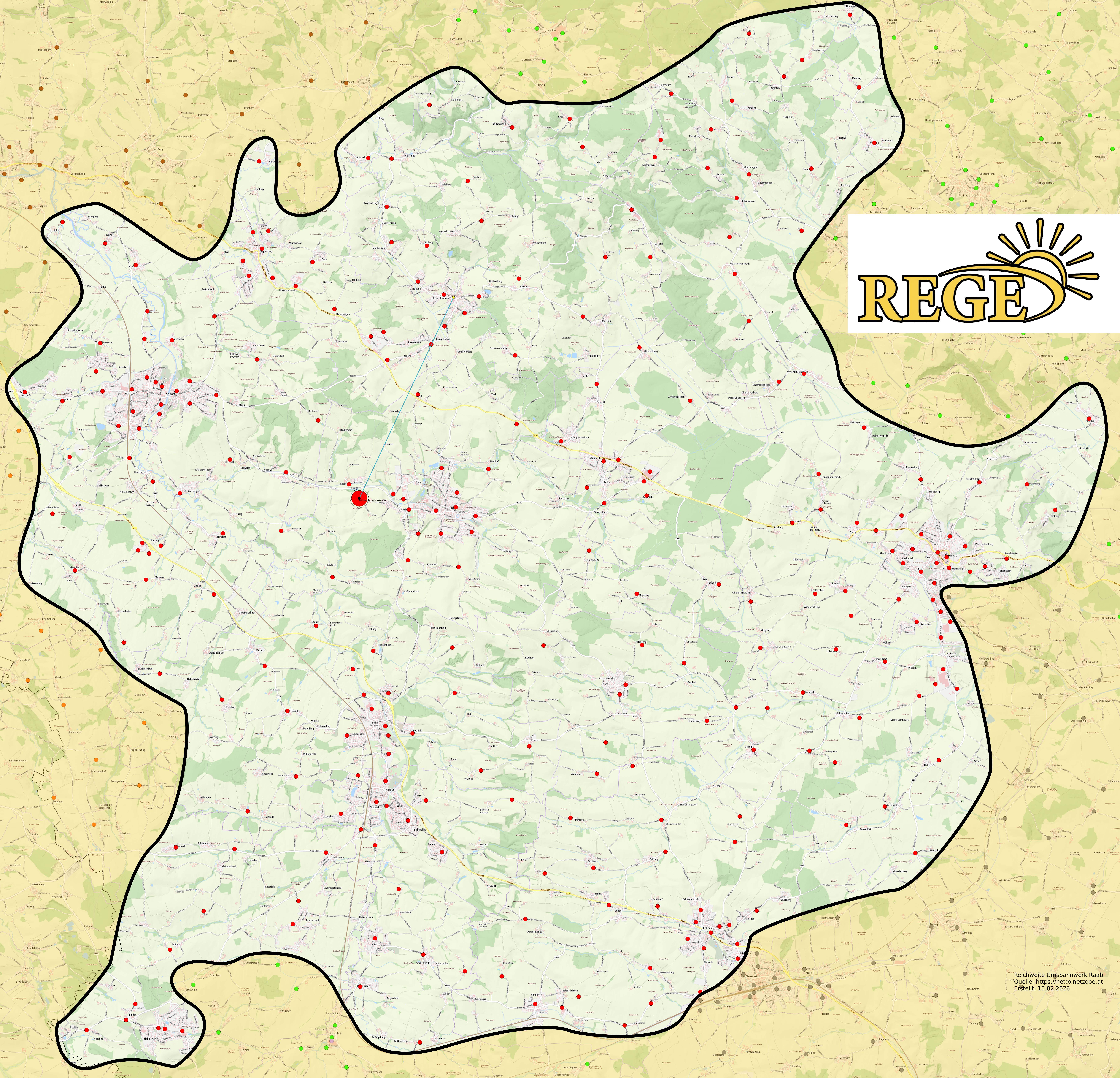 Die REGE ist eine regionale Energiegemeinschaft am Umspannwerk Raab. Es können somit grundsätzlich alle Anschlüsse, die vom Umspannwerk Raab mit Strom versorgt werden, der Gemeinschaft beitreten:
